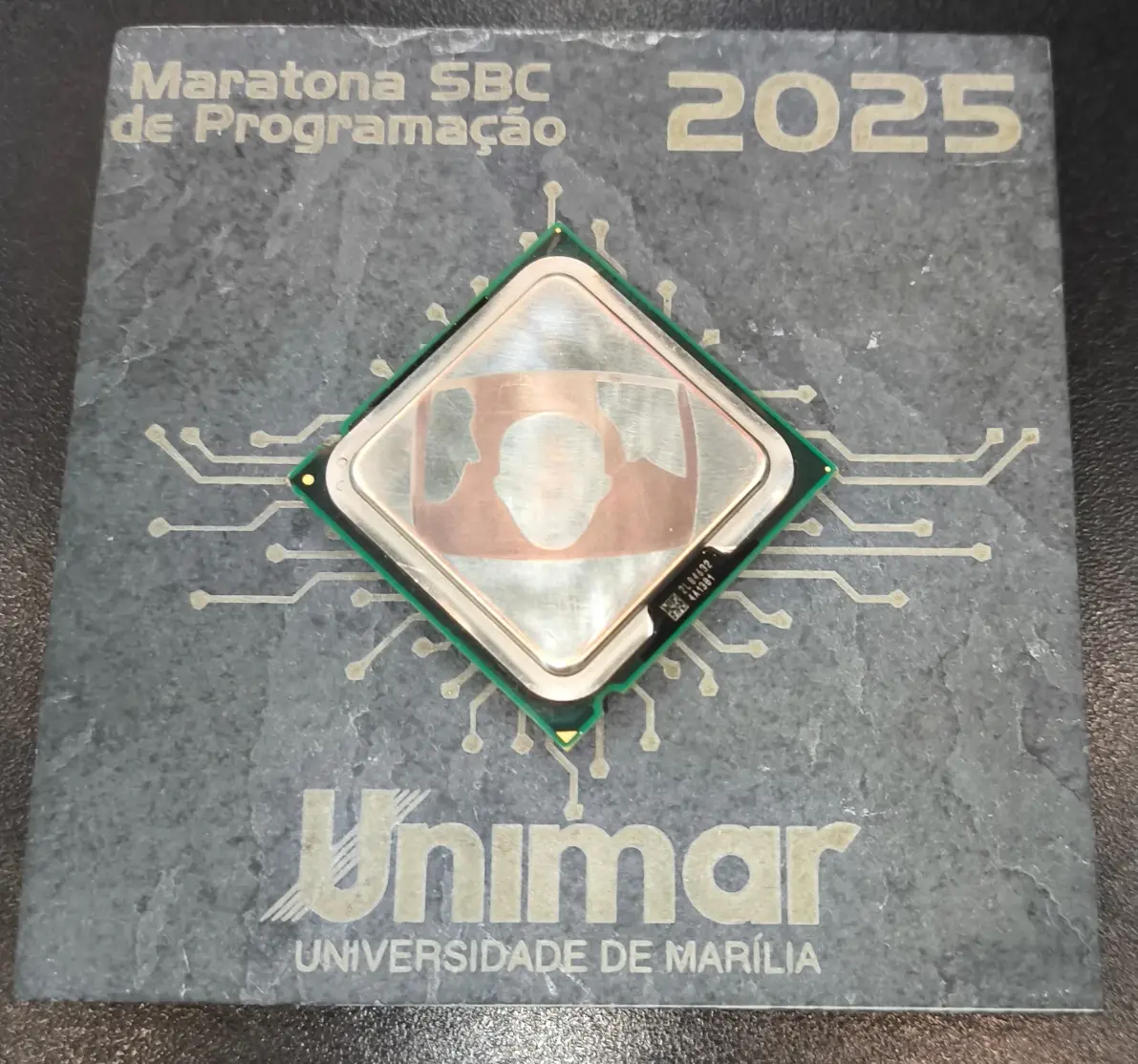O resultado foi uma peça única e autêntica. A base do troféu foi uma elegante placa de ardósia 10x10cm, um material natural que, com suas texturas e tonalidades, adicionou um toque de sofisticação. Sobre a pedra, gravamos a logo da UNIMAR, a logo da SBC e o texto detalhando o evento. O grande destaque, no entanto, foi a inclusão de um processador de computador real, colado à placa. Esse processador, com seus intrincados circuitos desenhados na ardósia, simbolizou o cérebro da tecnologia e a força do conhecimento dos participantes.